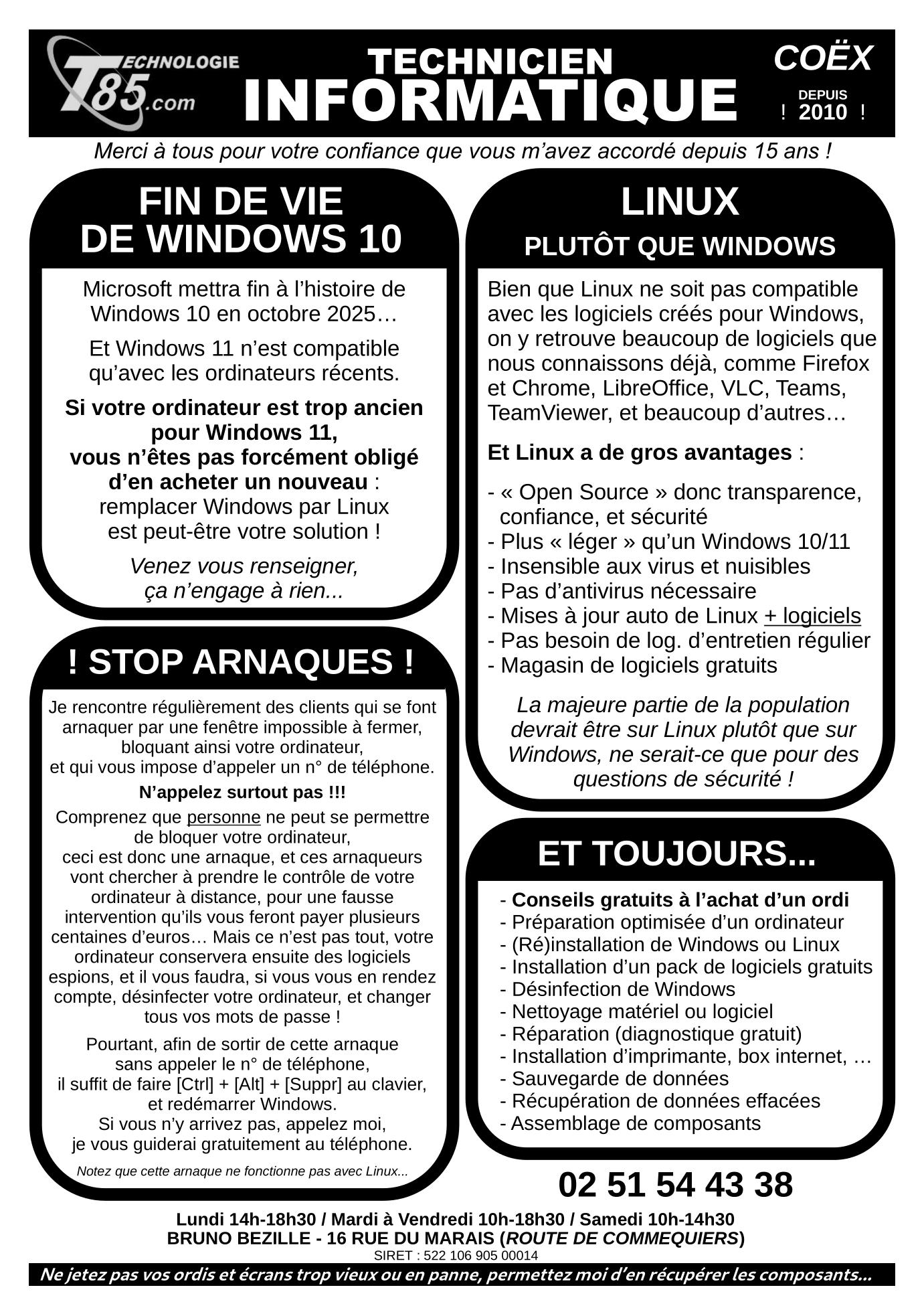 Il faut savoir aussi que Microsoft avait mis en place un système payant (30€) pour bénéficier d’une année supplémentaire de mises à jour, mais à condition d’avoir un compte Microsoft connecté à votre Windows 10, ce que je déconseille à mes clients (pour plusieurs raisons : vie privée, citoyenneté, géopolitique).